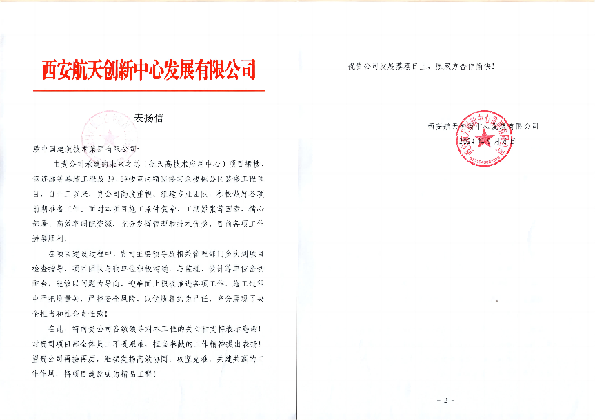 近日,西安航天创新中心发展有限公司向k1体育注册就送38元发来表扬信,充分肯定k1体育注册就送38元“未来之芯”项目部的工作,对k1体育注册就送38元高质量推进项目建设、优质履约给予高度评价。