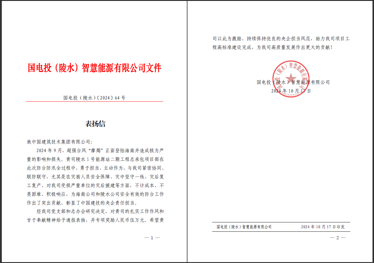10月17日,k1体育注册就送38元收到国电投(陵水)智慧能源有限公司表扬信。对k1体育注册就送38元海南陵水1号能源站二期工程项目部在今年9月超强台风“摩羯”登陆海南期间,为防台工作作出的突出贡献给予通报表扬。
