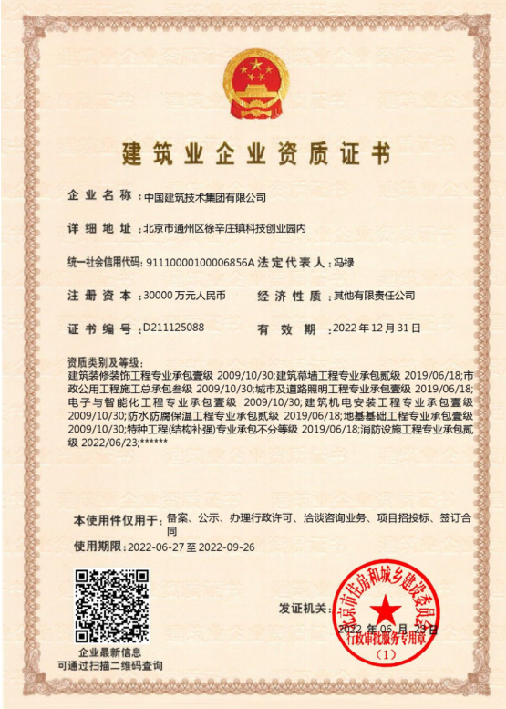 6月23日,经北京市住房和城乡建设委员会核准,中技集团获批消防设施工程专业承包二级资质。该资质的获批,成为中技集团落实“十四五”规划精神,打造全产业链平台优势的又一可喜成果。