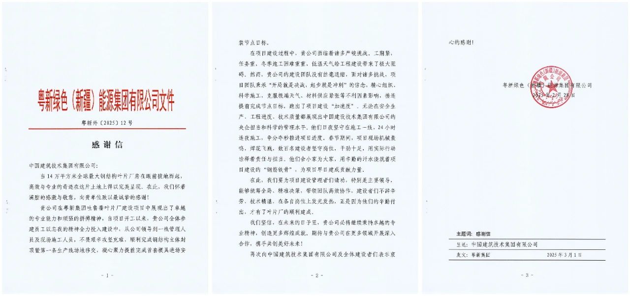近日,k1体育注册就送38元收到明阳智慧能源粤新绿色(新疆)能源集团有限公司发来的感谢信。对k1体育注册就送38元在14万平米的全球最大钢结构叶片厂房——吐鲁番叶片厂房项目建设过程中的优异表现,给予了充分肯定和真挚感谢。