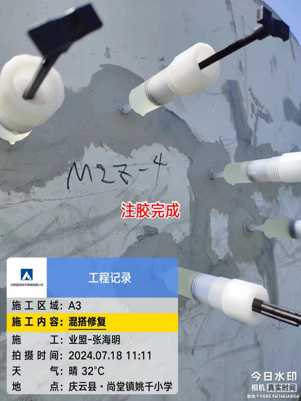山东省德州市的中广核庆云尚堂风电场位于山东省德州市庆云县尚堂镇。WD195-5000型风电机组,混凝土部分为预制装配式结构,混塔总高110.03m,共28层。M01~M26高3.99m,M27高3.60m,M28高2.4m。M01~M07外径7800mm,M09~M14外径6600mm,M16~M28外径5400mm,M08、M15为过度节段。除门洞位置外,M01管片壁厚为300mm,M02~M27管片底部壁厚300mm,M28管片底部壁厚1050mm。M01~M15各由两个C型管片组成,通过竖缝插筋连接并灌浆,组成完整O型管片。管片M16~M28为完整的预制O型管片。我单位需对塔筒节间缝隙重新补胶,并对个别塔进行空鼓、掉块及裂缝进行修复。