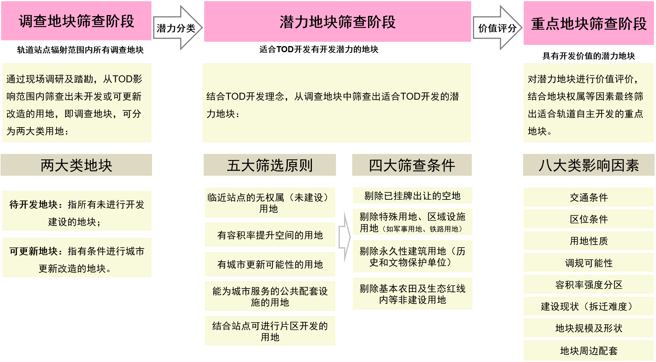 对初级阶段筛选出来的地块进行进一步的筛选,该阶段主要为潜力地块筛查阶段。结合TOD开发理念,筛查出适合TOD开发的潜力地块: