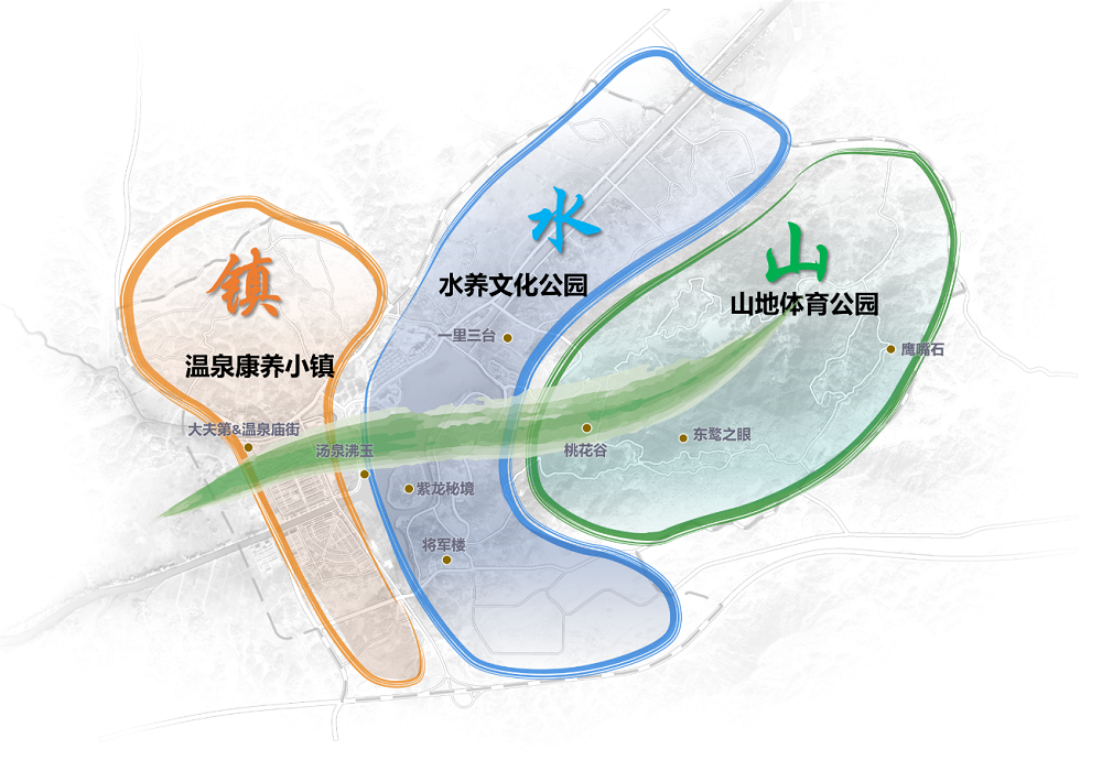 规划形成“两公园一小镇、八景点一通廊”的空间结构,以紫龙湖为核心打造温泉康养文化公园;结合东鹜山打造山地体育公园;结合灰汤镇区打造灰汤温泉民俗小镇;打“汤泉沸玉、鹰嘴石、桃花谷、将军楼、大夫第&温泉庙街、一里三台、东鹜之眼、紫龙秘境”灰汤八景;依托乌江、紫龙湖、东鹜山形成山水景观视线通廊。