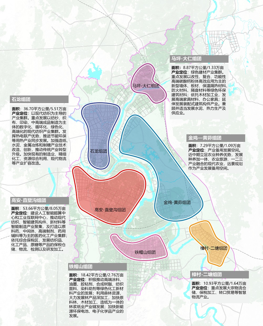 特色产业集群布局——综合考虑自身优势资源、临港产业基本形态、大湾区产业外溢、上位政策与规划导向等影响因素的基础上,三江口新区的产业选择按照“湾区所需、来宾所长”和“来宾所缺、湾区所溢”的思路进行取舍,重点打造绿色建材、现代纺织、医药化工、林浆纸一体化、新能源新材料、智慧物流六大产业集群。